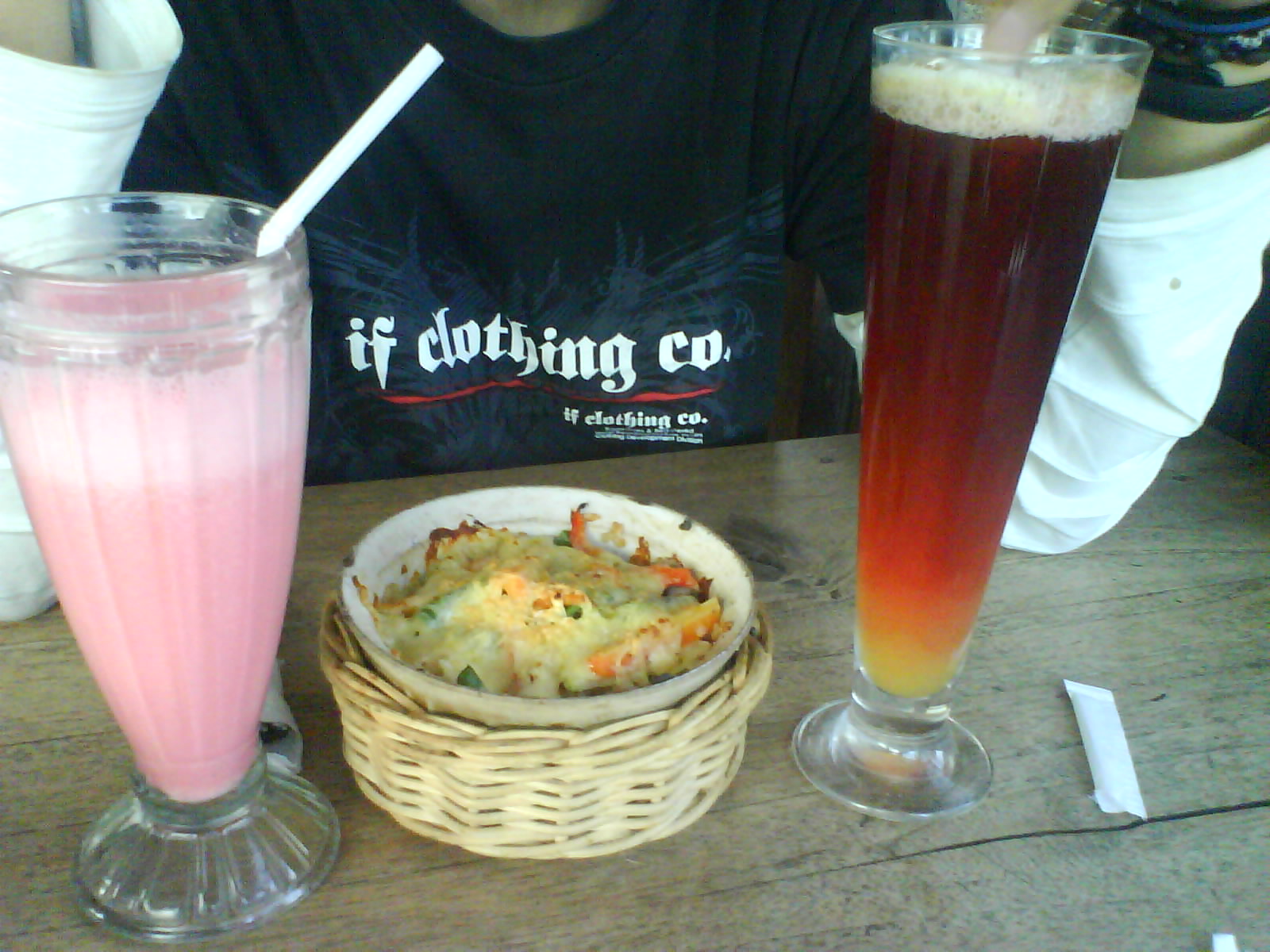 Tree House ada yang di dago dan ada yang di ciwalk, klo yang yang di dago adanya di deket jalan iman bonjol. minuman yang di atas itu minuman yang buat berdua harganya 20rbu, tapi saya lupa apa namanya,, maaf. dan yang gmbar setelahnya itu ayam, dan saya juga apa namanya dan harganya. lalu yang berikutnya kentang sosis. untuk yang minumannya itu enak, ada bermacam-macam buah di dalamnya, dan sangat menyegarkan asam-asam gtu. lalu makanannya enak c tapi cepet ngebosenin,, kentang dan sosisnya biasa aja. :D